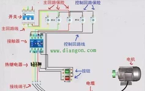 電路當(dāng)中,要想讓電機(jī)轉(zhuǎn)動(dòng),就必須給電機(jī)接線柱通入三相交流電,如圖所示,合上電源開關(guān),三相交流電通過黃綠紅三根主回路線流經(jīng)主回路保險(xiǎn)、接觸器主觸點(diǎn)、熱繼電器主端子、接線端子、電纜、最后到電機(jī)接線柱,只要接觸器吸合,接通,電機(jī)就會(huì)轉(zhuǎn)動(dòng),接觸器釋放,電機(jī)就停止,這就是主回路。但接觸器怎么才能吸合呢?www.diangon.com就需要控制回路控制接觸器,控制回路給接觸器線圈通電,接觸器就吸合,斷電就釋放。控制電流通過控制保險(xiǎn),黑色控制線、按鈕、熱繼電器輔助觸點(diǎn)、接觸器輔助觸點(diǎn)、到接觸器線圈,按下啟動(dòng)按鈕,接觸器線圈通電,吸合,主觸點(diǎn)閉合,控制主回路接通。按下停止按鈕,接觸器線圈斷電,釋放,主觸點(diǎn)斷開,主回路斷電。這就是主回路和控制回路的關(guān)系。